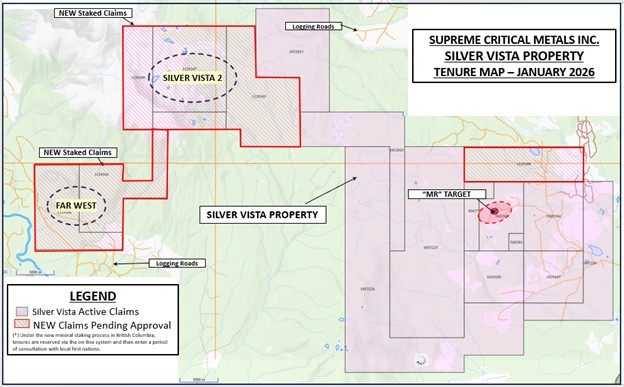 In January 2026, the Company significantly expanded the Silver Vista land package through the staking of additional claims, adding the Silver Vista 2, Far West, and North Flank (MR expansion) target areas. These new targets were selected following a review of an extensive regional database comprising more than 8,000 soil samples, 700 stream sediment samples, and airborne magnetic geophysical data, which identified geochemical signatures comparable to the MR Zone silver-copper mineralization.